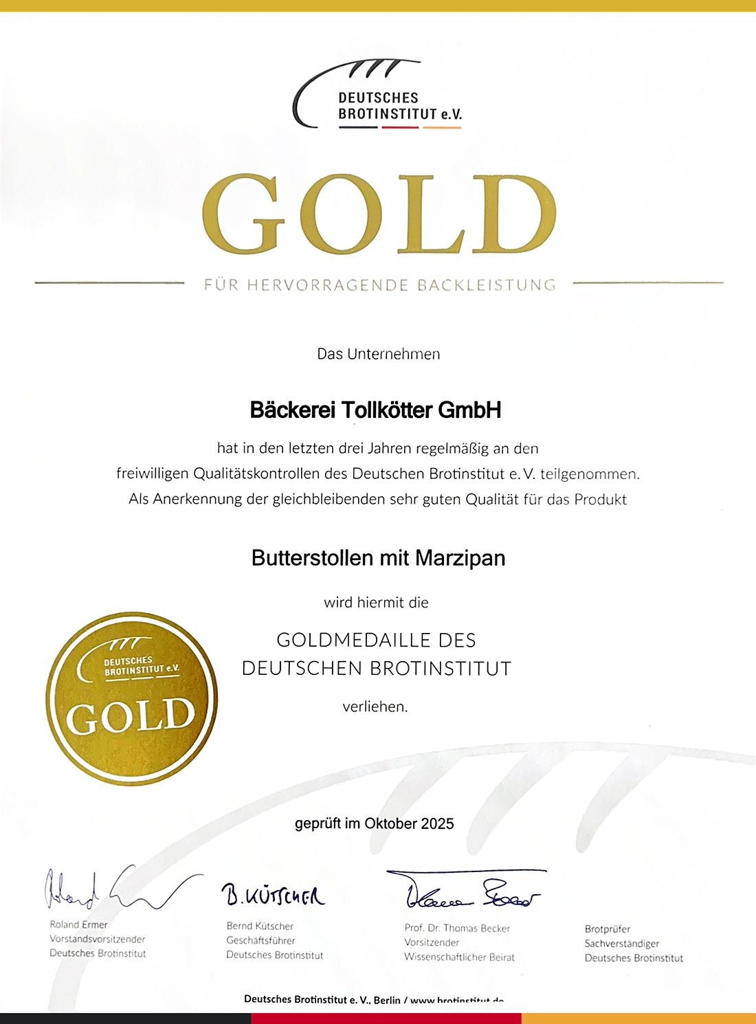 Freuen Sie sich mit uns auf die Weihnachtszeit! … und über unsere jüngste Auszeichnung durch das DEUTSCHE BROTINSTITUT für Tollkötters Butterstollen mit Marzipan.